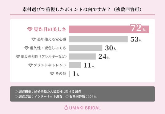 そこで今回『UMAKI BRIDAL』(https://umaki-bridal.jp/)を運営する株式会社アイジュエリー・ウマキは、全国の20~60代の男女104名を対象に「結婚指輪の人気素材」に関するアンケートを実施しました。