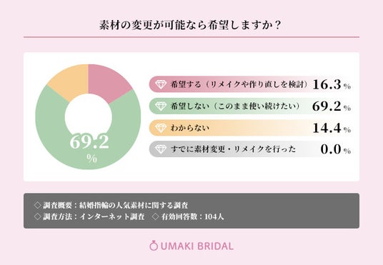 ・素材変更を希望しない人が約7割で69.2%が「このまま使い続けたい」と回答し、選んだ指輪への愛着の高さが判明