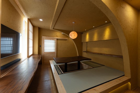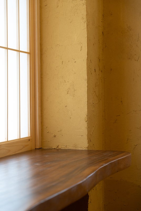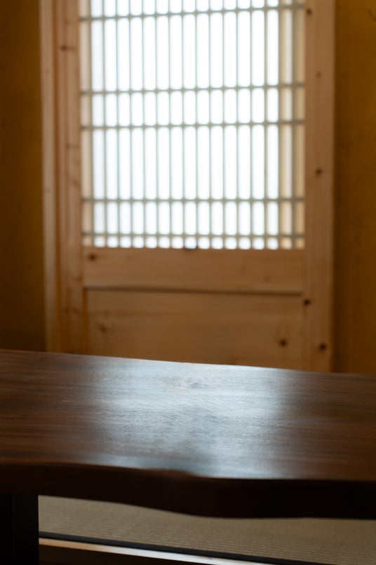 5mにもおよぶ一枚板のカウンターは厚さ60mmの希少なモンキーポッド。耐久性にも優れたベトナム材で美しい木目と濃淡のある色合いが特徴です。障子や玄関扉の建具には日本のヒノキを使用しています。また壁はスタッコ仕上げを施し、自然で独特な質感が重厚感を演出します。