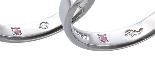 リングの内側に刻まれたブーケとブートニアは二人の愛の証。大切な誓いをセントセシリアローズに託して…。それぞれのリングの内側に愛の花、薔薇のブーケ(画像右)とブートニア(画像左)のマークが刻印され、ふたりの永遠の絆と幸せを祈り、薔薇色の宝石「ローズサファイア」を施しています。