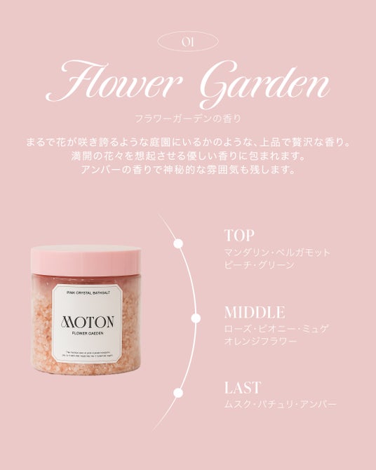 MOTONから至福のバスタイムが楽しめるピンククリスタルバスソルトが新登場!全身が高級感溢れる香りに包まれる癒しのひとときをお届けします