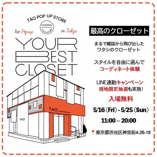 「最高のクローゼット TAO!」をコンセプトに掲げたポップアップストアを5月16日から表参道で開催~多彩なコーデ体験と最新ファッションを体感~