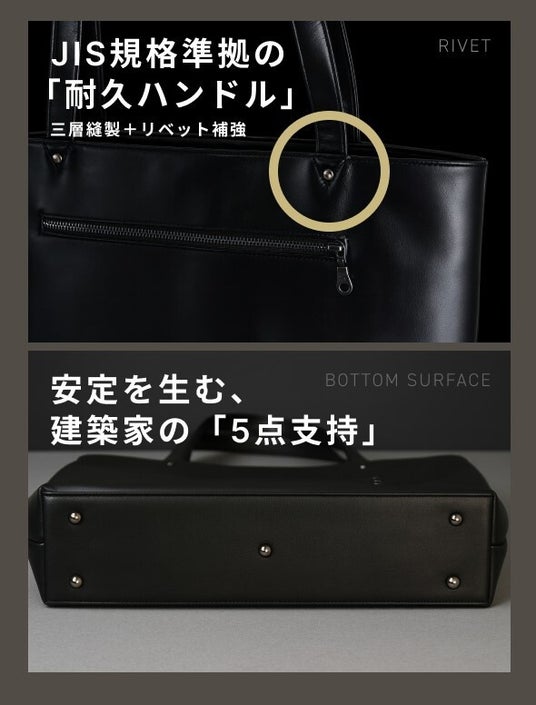 底鋲の位置、底面のフラットさ、マチのバランスを一級建築士監修のもとミリ単位で調整。