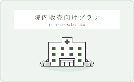 <院内販売向けプラン> クリニック内での患者様向け販売に特化したプランです。診療後のご提案や待合室での紹介など、院内での接点を活かした販売体制を構築します。処方設計からデザイン、パッケージ制作、院内で使用できるパンフレット・トークスクリプトの作成までサポート。まずは小規模からオリジナルコスメを導入したいクリニック様に最適です。