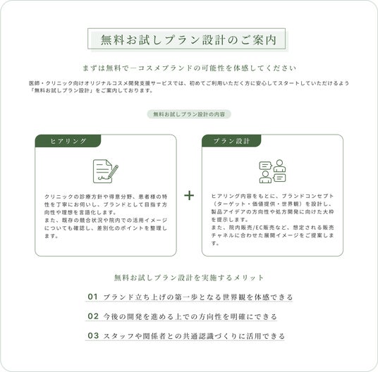 コスメクチュールでは、初めてご利用いただく方に安心してスタートしていただけるよう「無料お試しプラン設計」をご案内しております。実際のブランド開発プロセスの第一歩となるヒアリングとプラン設計を、費用をかけずにご体験いただけます。