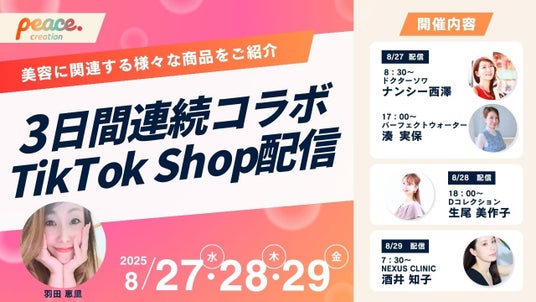 ソーシャルコマース専門のライバー・クリエイター事務所を運営する株式会社ピースクリエイション(本社:東京都千代田区、代表取締役社長:藤瀬公耀)は、所属トップクリエイター「羽田恵里アパレル社長」が、2025年8月27日(水)より3日間連続で、豪華ゲストを迎え、美容と健康に関連する多彩な商品をTikTok Shopライブにて配信することをお知らせいたします。