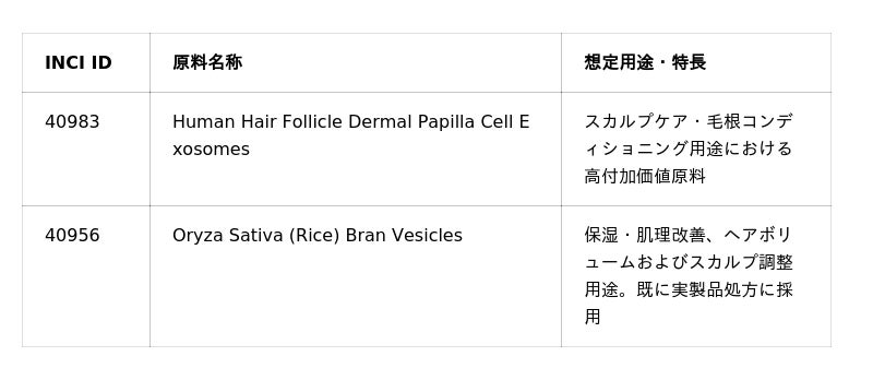 さらに、今回 INCI 認証を取得した有機米糠由来ベシクルは、すでにヘアボリュームおよびスカルプコンディショニング用途の処方に採用され、市場から高い支持を得ています。加えて、複数の植物由来エクストラセルラーベシクル(Plant Extracellular Vesicles)の開発も完了しており、今後は高機能スキンケアおよび医療グレード原料への応用を段階的に進めていく予定です。