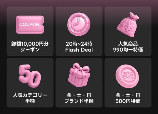 アウター、ニットなど冬の基本アイテムから、ドレス、ワンピースなど年末のパーティーファッションまで、カテゴリー別に商品をリーズナブルな価格で見つけられる「Flash Deal」コーナーも運営します。その他にも、990円から1,990円までの均一価格で提供する「均一価格コーナー」、週末限定の人気商品をたった500円で購入できる「金土日500円ディール」など、割引特典を強調したプロモーションを用意しています。