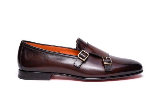 アンティーク仕上げを施したレザーがラグジュアリーな風合いを醸し出すダブルバックル