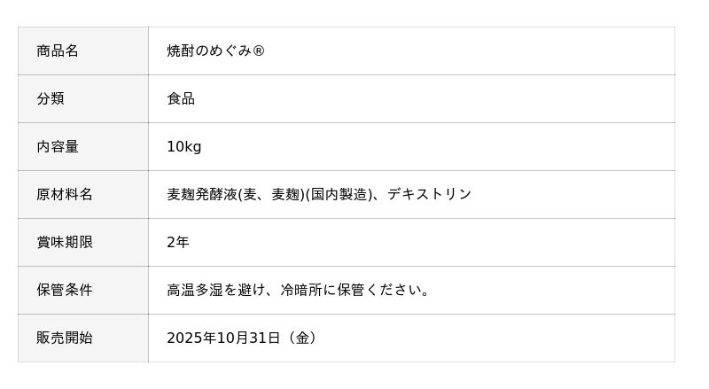 『焼酎のめぐみ(R)』は、麦焼酎のもろみを濃縮し、さらに使用しやすく粉状へ加工した食品です。酵母などの豊富な栄養素を含む天然素材として注目されており、たんぱく質、有機酸やクエン酸、ポリフェノールなど様々な栄養成分が含まれています。