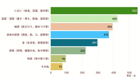 最も多かったのは「におい」552 名で全体の74%。次いで「温度・湿度)」425名、「触覚」が394名。生活環境や使用品に起因する刺激が主な要因であることが分かりました。<図2>