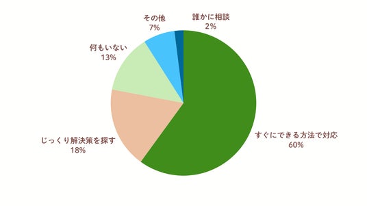 不快を感じた際の対応について「すぐできる方法で対応する」が60%、次いで「じっくり解決策を探す」が18%と約8割が何らかの行動をとっていることが分かりました。<図3>