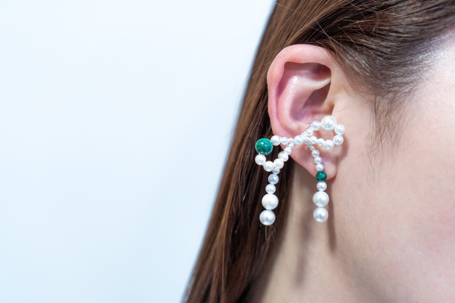 パールの中にカラーストーンを入れ込んだ、リボン型のイヤーカフ。