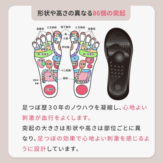 與那嶺氏の足つぼ技術のノウハウを凝縮し、場所により高さや大きさを変えた86個の突起で足裏を満遍なく刺激し血行促進を促しつつ、自然に正しい姿勢をサポートします。