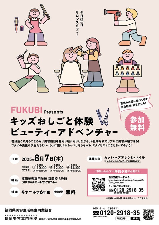 福岡県美容生活衛生同業組合と美容組合が運営する福岡美容専門学校の共催で、4才~小学6年生の方を対象に次代を担う子どもたちに向けて美容業の魅力や仕事の大切さを伝えるイベントを開催します。