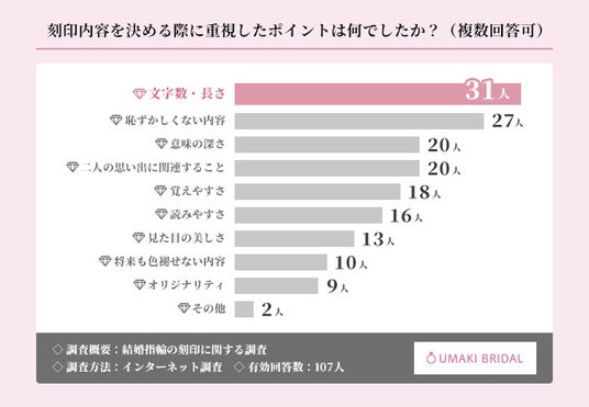 次に「刻印内容を決める際に重視したポイントは何でしたか?(複数回答可)」と質問したところ、『文字数・長さ』(31人)が最多となりました。
