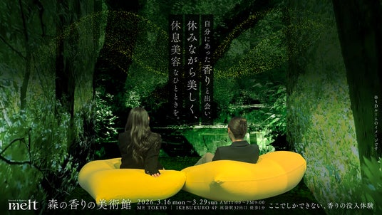 花王株式会社のヘアケアブランド「melt(メルト)」は、都会の真ん中で森林浴を楽しめる「森の香りの美術館」を、METOKYO IKEBUKUROにて2026年3月16日(月)から3月29日(日)までの期間限定でオープンします。本イベントでは、パンフレットを片手に美術館を巡るように鑑賞しながら没入できる、香りと髪をテーマにしたアート型導線の体験を提供します。深呼吸したくなる香りに包まれる没入型の映像演出をはじめ、視覚や嗅覚などの感覚で楽しめる“5Dの森林浴体験”や香りの展示アートなどを通じて、自分に合った香りと出会い、ブランドが提案する“休みながら美しく、休息美容”なひとときをお届けします。