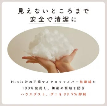 ユニースリープ枕の中綿はHuvis社の正規マイクロファイバー抗菌綿を100%使用し、細菌の繁殖を防ぎ、ハウスダスト、ダニを99.9%抑制します。