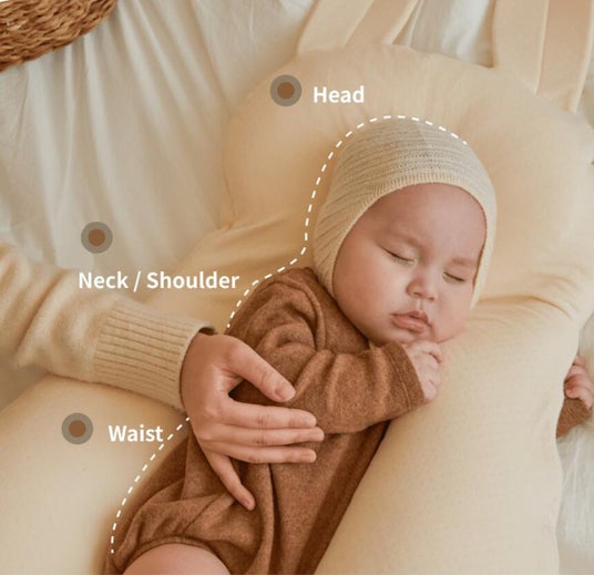 ユニースリープは、両サイドの抱き枕部分によって、赤ちゃんの手足が枕を抱く体勢を作り、予想できないタイミングでの寝返りのリスクを減らすことができます。赤ちゃんの身体に無理な圧が掛からない設計です。