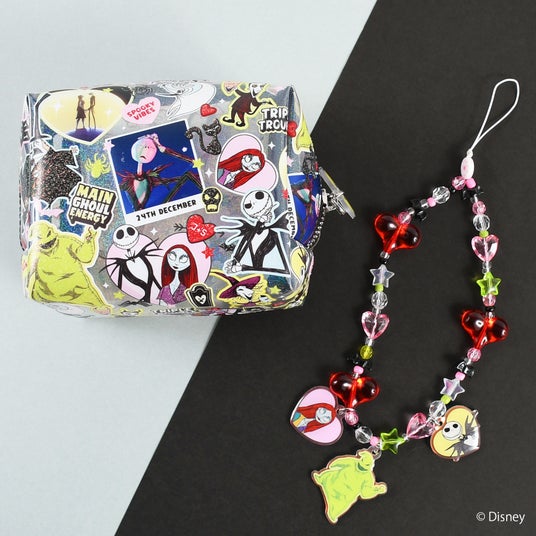 ハロウィン・タウンの住人達をグリッターで煌びやかにデザインしたポーチ。マルチ使いしやすいコンパクトなサイズ感で、ワイヤレスイヤホンや充電器、ケーブル、モバイルバッテリーなどのガジェットアクセサリーの収納にも最適。(サイズ目安:約W120×H85×D70mm)
