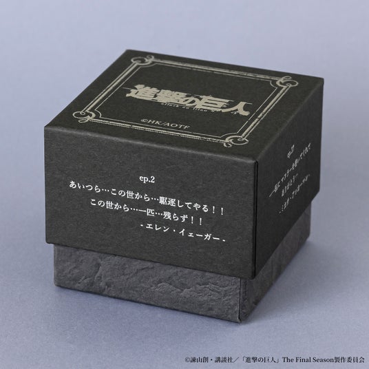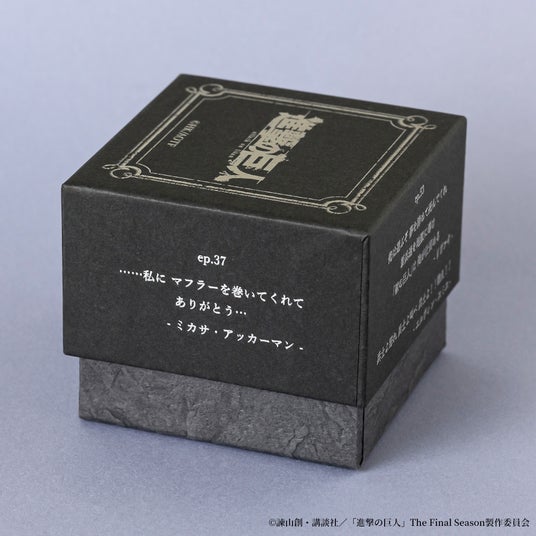 商品は、専用BOXにお包みしてお届け致します。 側面には商品モチーフで使用しているシーンのセリフをデザインし、見るたびに物語の一部を感じられる仕様となっております。ぜひ商品とあわせて世界観をお楽しみください。