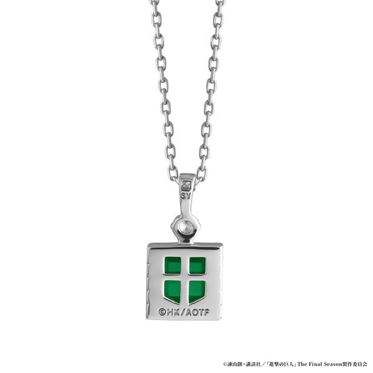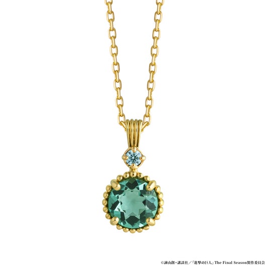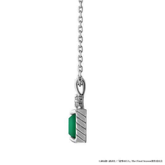 獣の巨人を倒すと誓ったシーンをイメージしました。メインには、「冷静沈着」「知性」の石言葉を持つグリーンオニキスをセッティング。グリーンの色は、調査兵団のマントのカラーをイメージしました。石枠の側面には立体機動装置の超硬質ブレードを思わせるラインを彫りこみ、裏面には自由の翼の紋章をイメージした透かし模様を施しました。バチカンには自由の翼をイメージしたクリアのキュービックジルコニアを留め、さりげない輝きを添えています。
