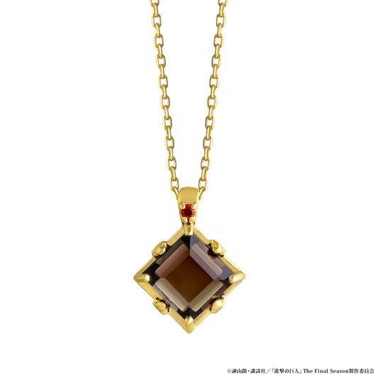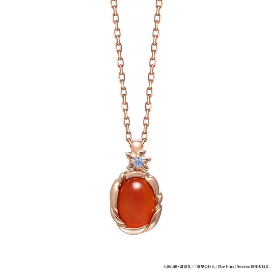 ミカサがマフラーを巻いてもらうシーンをモチーフにしています。「絆」「守護」「情熱」の石言葉を持つレッドアゲートで、マフラーのカラーをイメージ。布のやわらかさを感じる石枠にセッティングし、全体でマフラーを巻かれているミカサを表しました。バチカン部分は花の石枠にブルーのキュービックジルコニアを留め、そのシーンで足元に咲いていた花を表現しています。普段クールなミカサの、時折見せる可愛らしさを感じるようなデザインです。