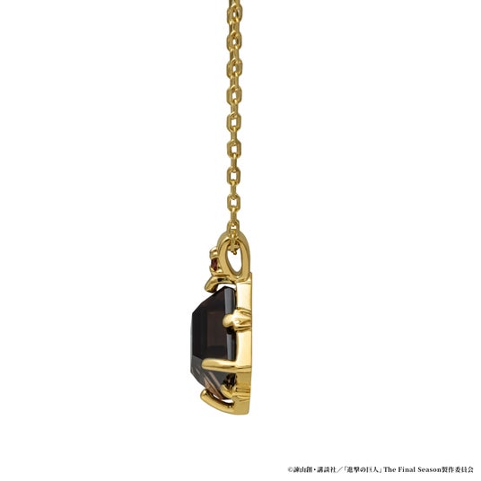 大切な人を失ってきたハンジがミカサの悲しみに寄り添うシーンをイメージしています。メインには「責任感」「安心感」の石言葉を持つスモーキークォーツをセッティングし、ハンジの髪色を表現しました。その上には瞳の色をイメージしたキュービックジルコニアをセッティング。石のカラーとシャープなフォルムでハンジの知性と個性が感じられます。石枠にはスモーキークォーツの四方を囲むように今まで戦ってきた巨人達の姿をデザインしました。