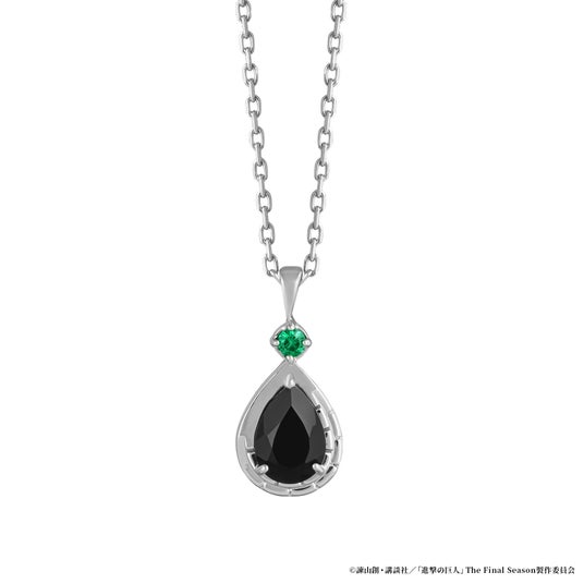 母親が巨人に食べられてしまい、涙を流しながら復讐を誓うシーンをイメージしました。壊されたレンガの街並みをデザインした石枠に、涙をイメージしたしずく型のオニキスをセッティング。オニキスは「忍耐」「成功」の石言葉を持ち、深いブラックカラーはエレンの心情を表現しています。オニキスの上には、エレンの瞳のカラーを思わせるグリーンのキュービックジルコニアがきらめき、裏面にはエレンが身に着けている地下室の鍵を刻印しました。