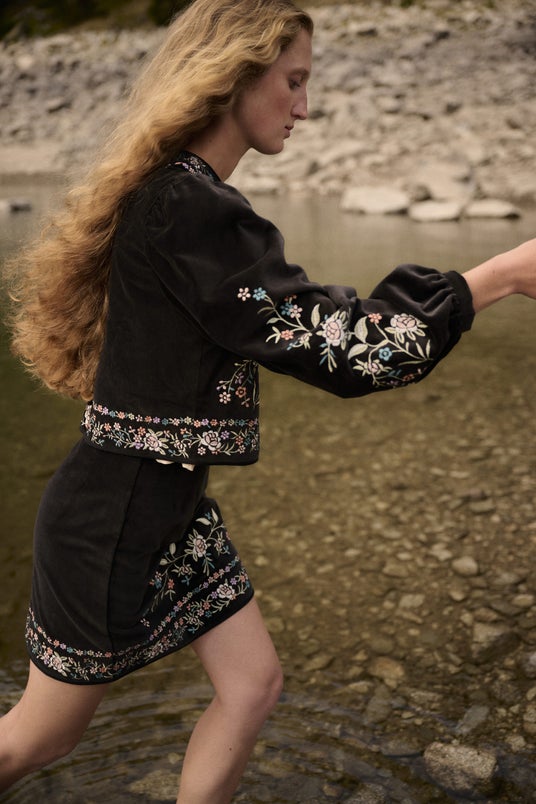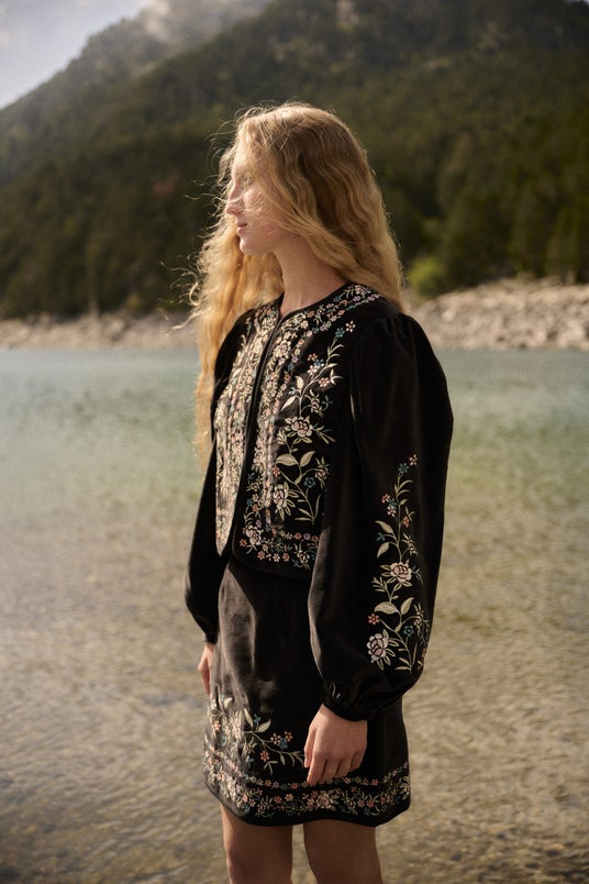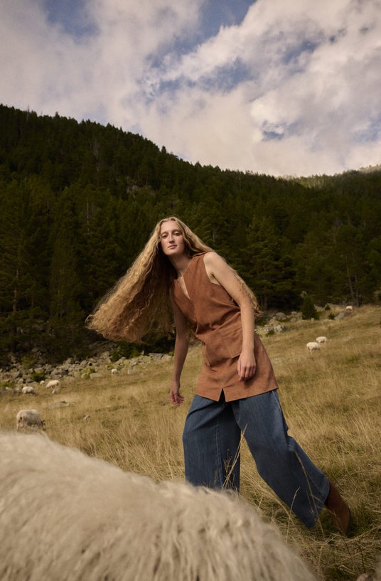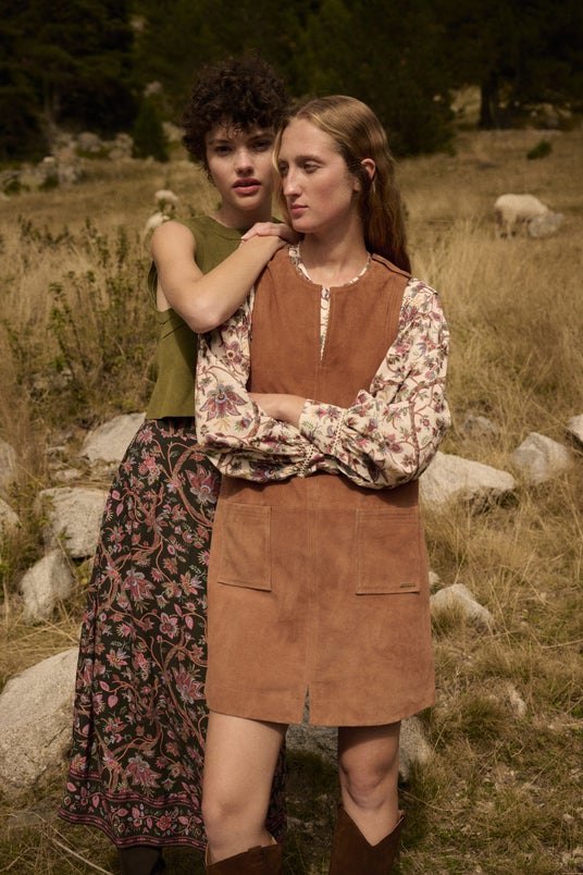Louise Mishaの秋冬コレクション第二弾では、レザーのドレスやトップス、スカート、ベルトに加え、温かみのあるニットや多彩な刺繍を揃えています。南フランスの山岳地帯で撮影され、野生動物の息づかいを感じさせる、力強く自由なエネルギーが魅力です。