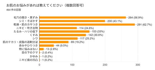 その結果、464件の回答が集まり、「乾燥・かさつき(62.7%)」「毛穴の開き・黒ずみ(56.9%)」「しみ・そばかす(43.1%)」といった年齢とともに変化する肌悩みが上位を占める結果となりました。