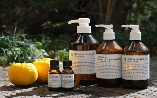 さわやかでほろ苦い香りの柚子精油と、甘くみずみずしい香りの伊予柑精油をブレンドした「ユズ/イヨカン」。この時季の旬な香りが楽しめるシリーズとして、今季初登場しました。春先にかけての保湿ケアにおすすめの全身用乳液や、毎日のお手入れに使えるハンドソープとボディソープ、香りそのものを楽しむためのエッセンシャルオイルなど、日常使いに便利な4アイテムを数量限定でご用意しました。