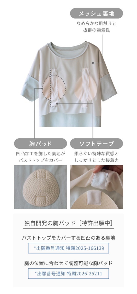 新しい胸パッドである「調整パッド」は、ブラを着用しなくても安心して着られるブラレス設計。