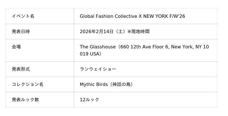当日は、コレクション「Mythic Birds(神話の鳥)」として12ルックを披露し、ショー直後には会場から大きな拍手が起こりました。さらに、主催者Global Fashion Collectiveによる公式プレスリリースでもOUNCHANは紹介されました。