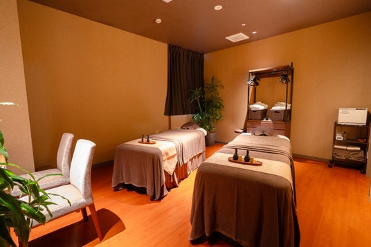 内装はブラウンとベージュを基調としたナチュラルなデザインに、観葉植物を配した温かみのあるインテリア。都市の喧騒を忘れ、ゆったりとした時間が流れる空間で、深いリラクゼーションを実現します。