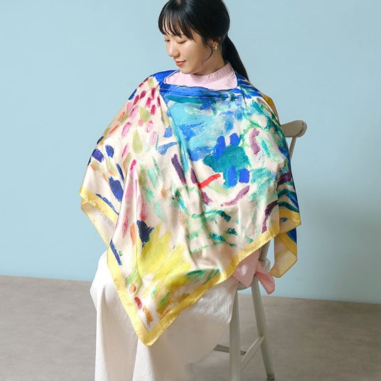 スカーフとしても使える授乳ケープです。独自の構造で授乳時、赤ちゃんの顔が見えるようワイヤーが入れられます。シワになりにくい素材なので、小さくまとめていつでもカバンの中に入れて持ち運べます。授乳が終わってもワイヤーを取り外して、スカーフとして長くお楽しみ頂けます。