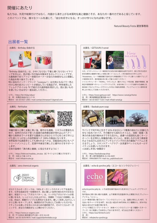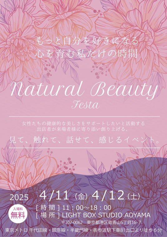当店のビジョンをさらに広く共有し、多くの女性の健康的な美しさをサポートするため、2025年4月11日(金)・12日(土)に南青山にて「Natural Beauty Festa」と題したフェムテック展示会を開催いたします。