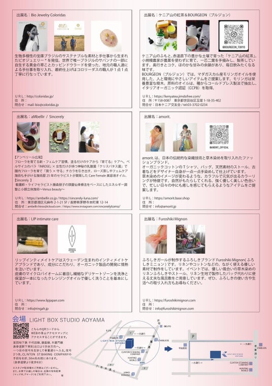 本展示会は、大手企業や大きなイベント会社が主催するものではなく、共通の価値観を持つ14のブランドが集まり、全員が主催者意識を持って企画・運営するものです。食品、化粧品、健康食品、フェムケアグッズ、ヨガ、アパレルなど多岐にわたる出展者が、単なる物販の場ではなく、感動を分かち合う場所を目指します。