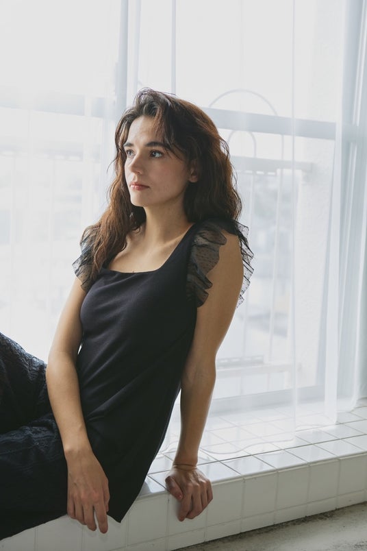 デザインも細部までこだわり、肩部分のフリルが気になる二の腕を可愛くカバー。スクエアネックなので、デコルテ周りをスッキリ見せてくれます。締め付け感の少ないブラカップ付きなので、一枚でも気軽に着用できます。