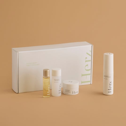 Herz skinの肌育3ステップ、導入美容水、化粧水、クリームのトライアルサイズがセットに。7日間、朝晩お試しいただける限定サイズで、ゆらがない肌と出会う感動の肌育体験をお届けします。
