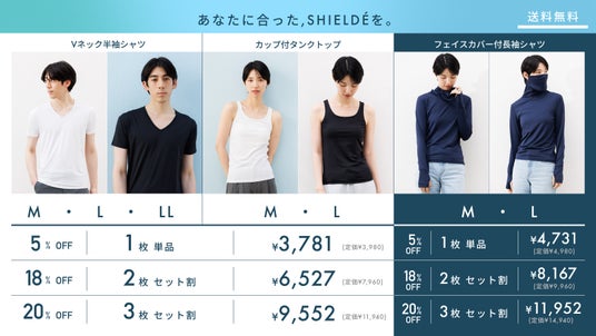 夏向けインナーウェアブランド 『SHIELDE(シルデ)』 は、接触冷感やUVカット、速乾、抗菌防臭機能に加え、放熱性プリント加工(特許技術)を採用。