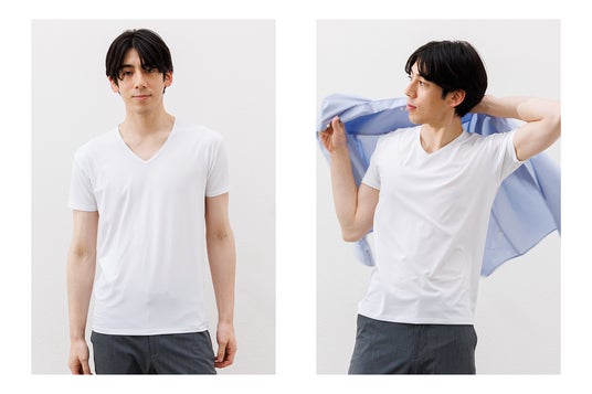 通勤や日常インナーとして使いやすいVネック仕様。制服や作業着の下でも着用しやすいベーシックモデルです。