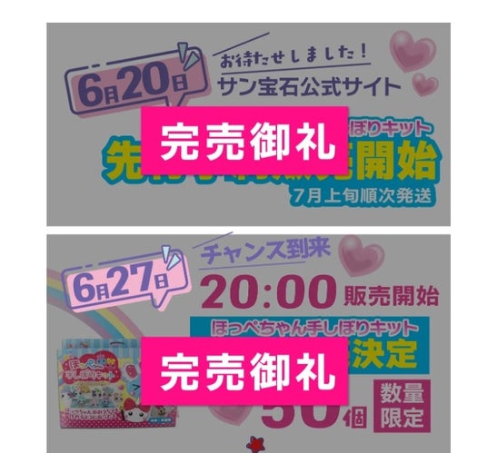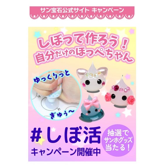 「ほっぺちゃん手しぼりキット」を使って自作したオリジナルのほっぺちゃんの写真や動画を、以下のハッシュタグをつけて投稿することで、抽選でサン宝石の人気グッズをプレゼント。キャンペーン応募期間は8月17日まで。締切以降も投稿は随時募集しており、サン宝石の公式HPで投稿写真や動画が紹介されるチャンスも。