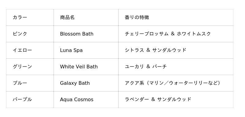 『Etoile Bain(エトワール バン)』は、クラウドファンディングで支援者の声と共に作り上げた5つのカラーと香りを展開しています。