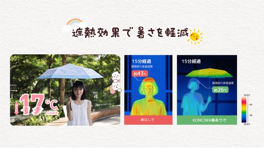 ■ UVカット率99.99%で、強い日差しからお肌を守る 高機能の遮光素材を使用し、紫外線遮蔽率は99.99%。紫外線による肌ダメージをしっかり防ぎ、傘下の体感温度を最大17℃カット。真夏でも快適な日陰空間を演出します。