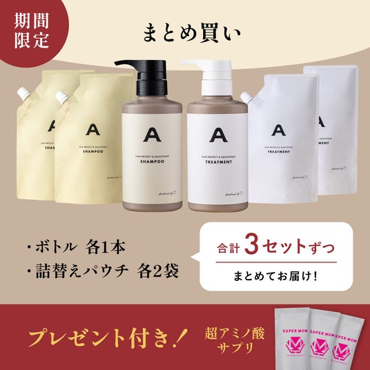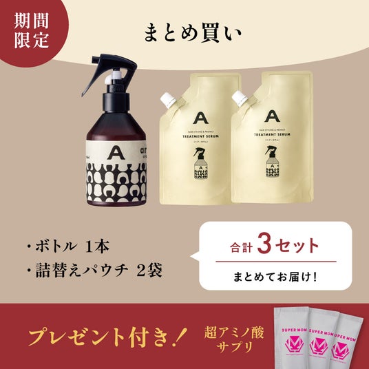 キャンペーン内容:シャンプー&トリートメント、ヘアーセラムそれぞれの「まとめ買い」セットが期間限定で登場。ご購入で特別プレゼント 超アミノ酸サプリ「SUPER MOM(スーパーマム)」1箱14包入りを一緒にお届けいたします。