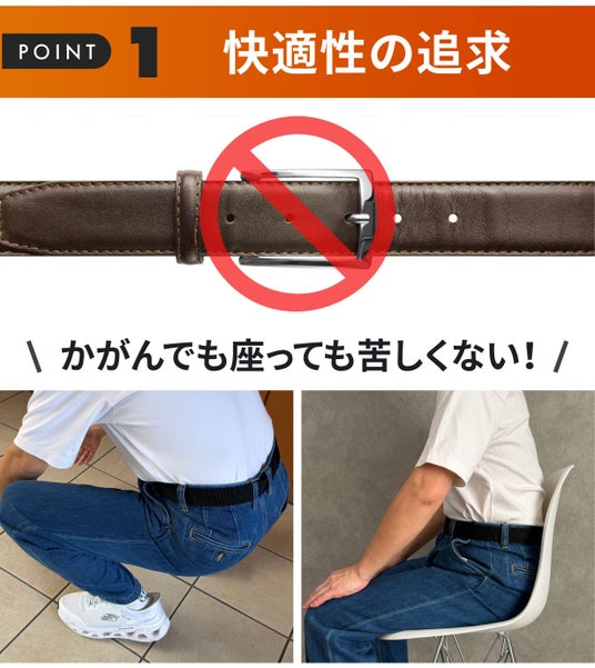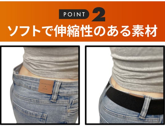金属バックルなし、穴あけなしのストレッチベルト。究極の快適さ、抜群の伸縮性で身体の動きに合わせて柔軟にフィット