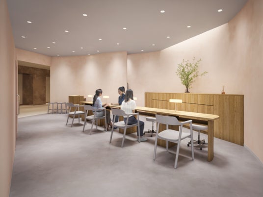 (3) 自然の温もりが調和する空間店内は、大きな窓から自然光がたっぷりと差し込む、開放感のある空間となっています。素材感のある壁や曲線を描く壁面がやわらかな光に包まれ、時間とともに表情を変化させます。入口から斜めに続くロングテーブルのネイルエリアは、木の温もりを感じるデザインで、ゆったりとくつろげる空間を演出しています。