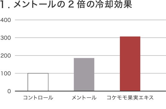 ※グラフはそれぞれ塗布後に、肌の温感センサーTRPM8の測定をし、(冷感成分の入っていない)コントロールを100とした場合の、相対的に数値化したデータになります。