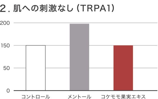※グラフはそれぞれ塗布後に、肌の刺激センサーTRPA1の測定をし、(冷感成分の入っていない)コントロールを100とした場合の、相対的に数値化したデータになります。